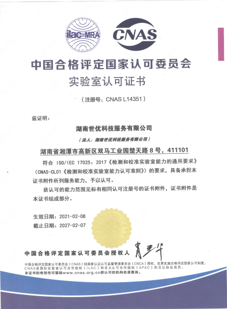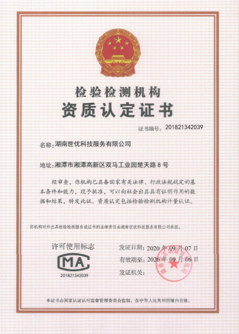 2020年9月,世優(yōu)科服已順利取得了由湖南省市場監(jiān)督管理局頒發(fā)的檢驗檢測機構(gòu)資質(zhì)認(rèn)定證書(證書編號201821342039),標(biāo)志著公司在技術(shù)能力和質(zhì)量管理方面都達到RB/T214-2017《檢驗檢測機構(gòu)資質(zhì)認(rèn)定能力評價檢驗檢測機構(gòu)通用要求》的要求。